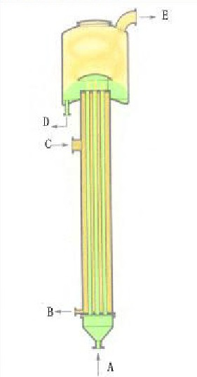 A:物料進口B:冷凝水出口C:蒸汽進口D:濃縮液出口E:二次蒸汽出口