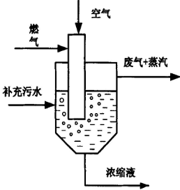 浸沒燃燒式蒸發器的主體是一個空心圓筒容器,中下部裝有被加熱液體。熱源是高溫的煙氣。將燃料(煤氣或油)和空氣混合后導入燃燒室燃燒,產生的高溫煙氣從浸沒于溶液中的噴嘴噴出。由于氣液兩相的溫差很大,加之氣液翻騰鼓泡,接觸充分, 故傳熱效率極高,蒸發強度很大。產生的二次蒸汽和燃燒尾氣從器頂的煙道排出。濃縮液從器底排出。