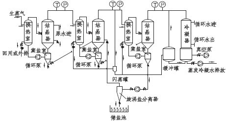 需要蒸發(fā)的物料經(jīng)進料泵進入一效加熱器進行加熱,然后進入蒸發(fā)室,進行蒸發(fā),在分離器中進行氣液分離,溶液從分離器底部流入循環(huán)泵吸入口,利用循環(huán)泵送入加熱器、分離器進行循環(huán)流動與蒸發(fā),蒸發(fā)出來的蒸汽進入冷凝器被全部冷凝。在蒸發(fā)換熱室內(nèi),外接蒸汽液化產(chǎn)生汽化潛熱,對廢水進行加熱。由于蒸發(fā)換熱室內(nèi)壓力較大,物料在蒸發(fā)換熱室中高于正常液體沸點壓力下加熱至過熱。加熱后的液體進入結(jié)晶蒸發(fā)室后,物料的壓力迅速下降,導致部分物料水溶液閃蒸或者沸騰。廢水蒸發(fā)后的蒸汽進入二效蒸發(fā)器作為動力蒸發(fā)器進行加熱,未蒸發(fā)廢水和鹽分暫存在結(jié)晶蒸發(fā)室。一效、二效、三效蒸發(fā)器之間通過平衡管相通,在負壓所用下,高含鹽廢水或物料由一效向二效、三效依次流動,廢水不斷被蒸發(fā),廢水中鹽的濃度越來越高,當廢水物料中的鹽分超過飽和狀態(tài)時,水中鹽分就會不斷地析出,進入蒸發(fā)結(jié)晶室的下部的集鹽室,整個過程周而復始,實現(xiàn)鹽水分離。